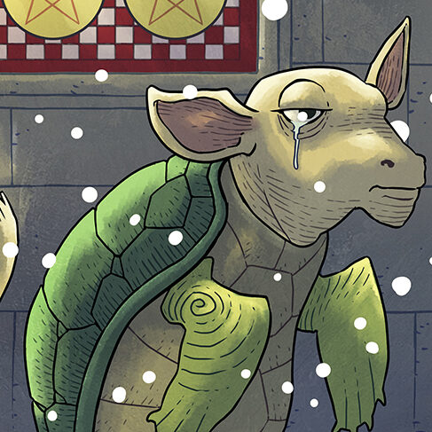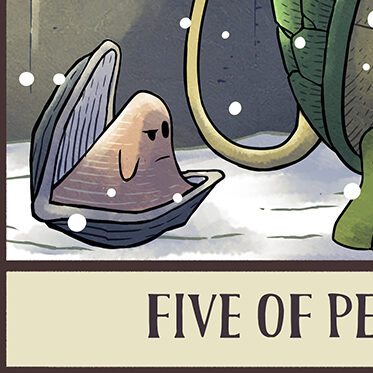 Sur la carte, deux figures fatiguées sont sous la neige : la tortue « fantaisie » et une des petites huitres du poème Le Morse et le charpentier chanté par les jumeaux Blanc Bonnet et blanc Bonnet (en anglais Tweedledum et Tweedledee) à Alice.