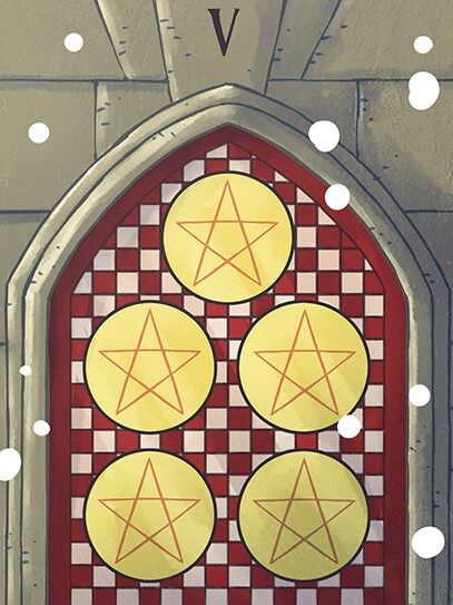 Le 5 de Deniers rappelle que les épreuves extérieures (comme le froid, le manque, la solitude que l’on voit ici) sont réelles, mais qu’il existe toujours une lumière à proximité. Sous la neige, nous pouvons à la fois être éprouvés par le vent mordant, et ressentir la caresse des flocons délicats. Le 5 de Deniers nous apprend à être attentif aux deux à la fois. Et puis la neige ne dure pas éternellement. À chacun de décider s’il reste dehors à souffrir, ou s’il cherche la chaleur qui n’est qu’à quelques pas.