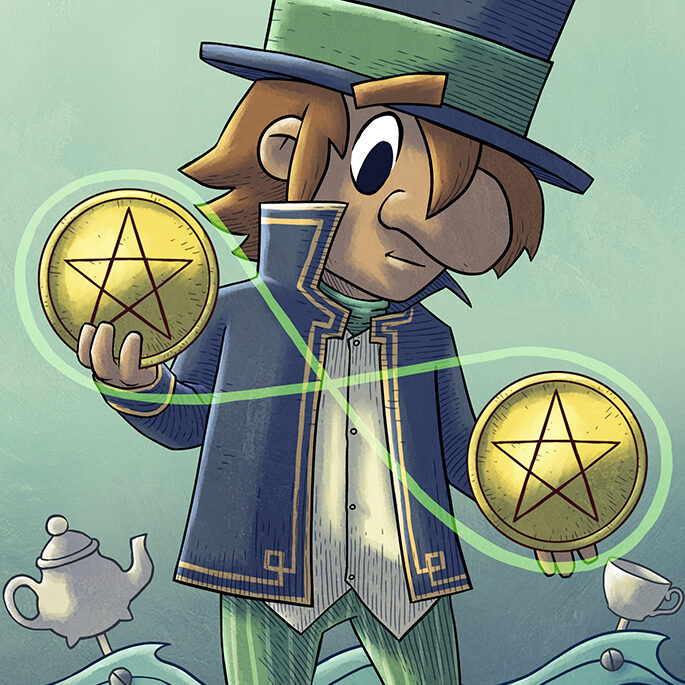 Le DEUX DE DENIERS, lui, il essaie de gérer. Il jongle. Nous voyons bien que rien ne va droit mais son visage nous assure que « si, si tout va bien ». Et nous avons envie de le croire, ce Chapelier fou qui fait de son mieux pendant que la Roue continue de tourner comme si de rien n’était.