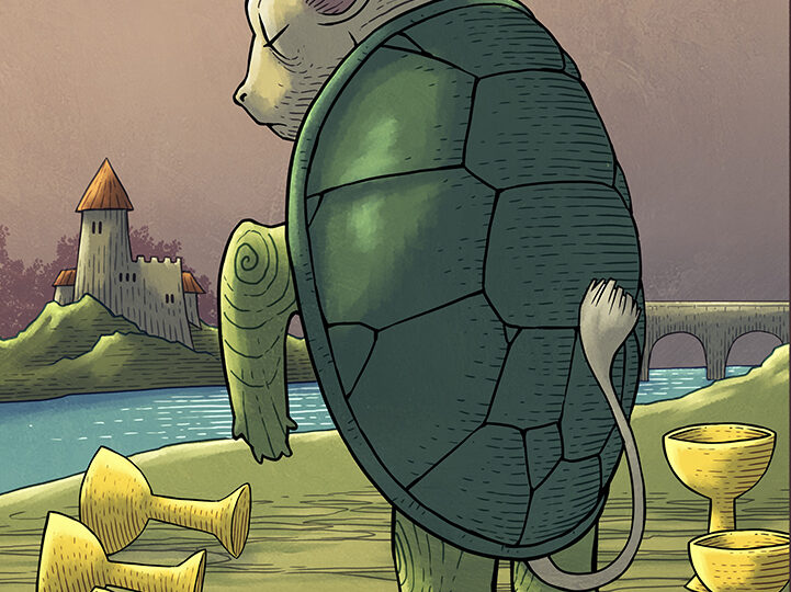 Ici, la Simili-Tortue, ce personnage mi-tragique mi-ridicule que le griffon présente à Alice, ferme les yeux, le visage empreint de regret. Elle se souvient de son école sous la mer, les matières farfelues qu’elle y apprenait, les danses qu’elle y pratiquant comme le quadrille des homards. La Simili-Tortue ressasse, elle s’accroche à un passé aussi absurde que précieux, à des choses qui étaient mais ne sont plus. Trois coupes sont renversées à ses pieds, deux restent debout… mais elle ne les voit pas.