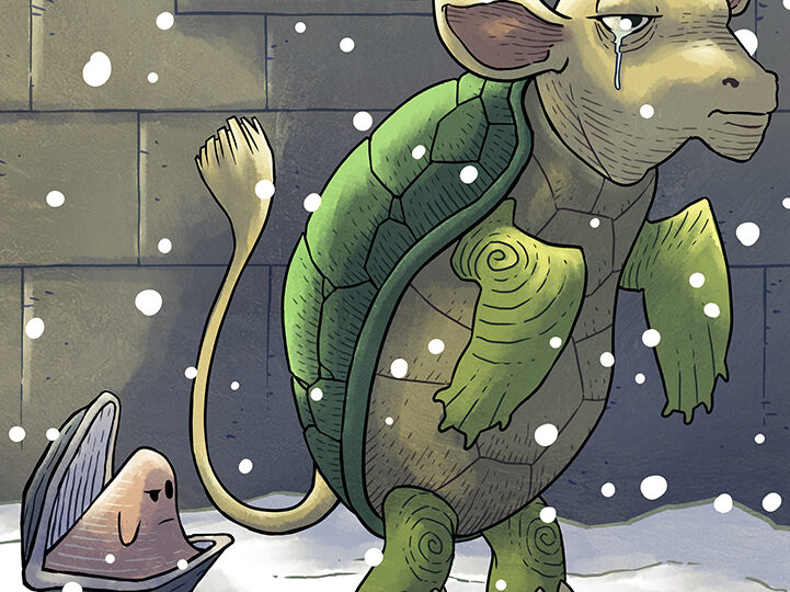 Sous une neige silencieuse, la Simili-Tortue réapparaît, une larme à l’œil, accompagnée cette fois d’une huître. Ce détail évoque le conte cruel du Morse et du Charpentier, dans lequel des huîtres naïves sont dévorées après avoir cru à de jolies promesses.