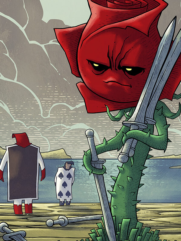 C’est la Reine de Cœur qui triomphe ici. Mais sur quoi ? Ses adversaires sont absents ou vaincus, deux soldats-cartes se tiennent à distance, et une rose rouge ramasse des épées. Le sentiment de cette carte n’est pas glorieux : il est tendu, incertain, presque honteux.