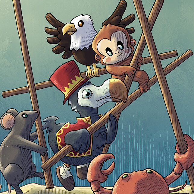 Un singe, un dodo, une souris, un crabe et un aigle s’affrontent dans une joyeuse pagaille. C’est la fameuse course cocasse, où tout le monde court sans direction claire, et où tout le monde gagne… ou perd.