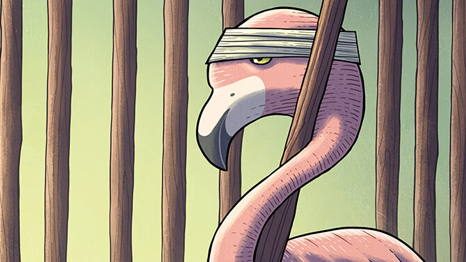 Le Flamant rose incarne ici la ruse et la fuite en douce.